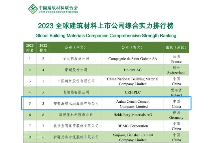 大會(huì)發(fā)布了2023年度全球建筑材料上市公司綜合實(shí)力排行榜,海螺水泥名列“2023年度全球建筑材料上市公司綜合實(shí)力排行榜”第5位。