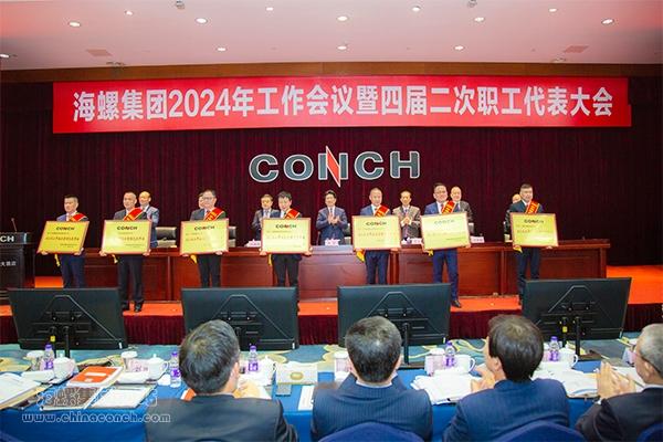 大會隆重表彰了集團公司2023年先進集體和個人,銅陵海螺、輕工國際合肥大中、河南嵩基新材料、寧波海螺新材料等24個單位榮獲“2023年海螺集團綜合管理先進單位”稱號;盧叔敏、韓文輝、段天祥、樂健等22名同志榮獲“2023年海螺集團優(yōu)秀管理者”稱號;鐘楠楠、詹融、張汝林、孫位仕等108名同志榮獲“2023年海螺集團先進工作者”稱號。