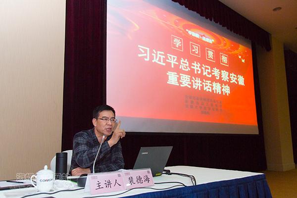 為教育引導(dǎo)集團(tuán)各級(jí)黨員干部深入學(xué)習(xí)習(xí)近平總書(shū)記考察安徽重要講話(huà)精神,認(rèn)真貫徹強(qiáng)化“兩個(gè)堅(jiān)持”、實(shí)現(xiàn)“兩個(gè)更大”的目標(biāo)要求,深刻領(lǐng)會(huì)精神實(shí)質(zhì),進(jìn)一步統(tǒng)一思想認(rèn)識(shí)、凝聚發(fā)展力量,10月28日下午,集團(tuán)公司邀請(qǐng)了安徽大學(xué)哲學(xué)系裴德海教授作了一堂題為《深入學(xué)習(xí)貫徹習(xí)近平總書(shū)記考察安徽重要講話(huà)精神》的專(zhuān)題講座。