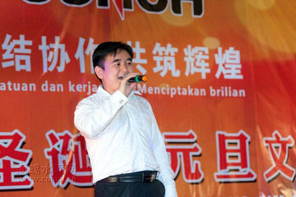 “你到我身邊,帶著微笑,流金的歲月,把你從遠(yuǎn)方帶到我的身旁”PT.SULENCO BOHUSAMI CEMENT公司董事長卓瑞瑞的一首《遲到》,在公司總經(jīng)理曾國華的即興伴舞下,把晚會氣氛推向一個新的高潮,掌聲、歡呼聲、吶喊聲,聲聲不絕,渲染了晚會歡樂的氣氛。
